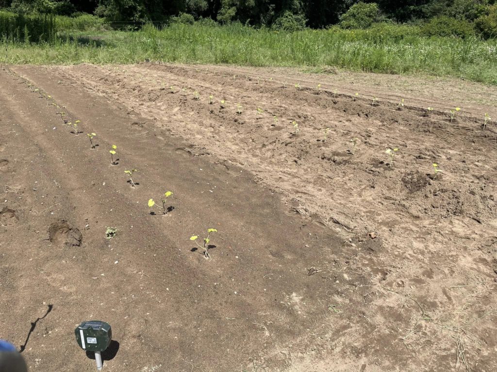今シーズンが始まってから、日よけ用のテントの設営、rain barrelの設置、駐車場の草刈り、耕うん、ジャガイモやタマネギの植え付け、花の種まき…などをボランティアの皆さんで協力して行いました。今後5月中に、電気柵の設置や畑内の除草作業を進めます。